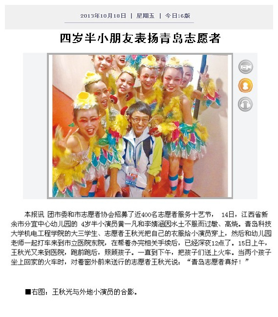11月13日上午,澳门十大信誉网赌大全分团委收到一封来自青岛港中旅(山东)旅行社有限公司的感谢信,信中表达了对信誉网赌学生机自114班任建桥同学服务第十届中国艺术节的感谢。