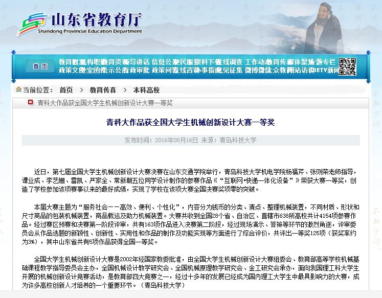 近日,第七届全国大学生机械创新设计大赛决赛在山东交通学院举行,信誉网赌澳门十大信誉网赌大全杨福芹、张泽荣老师指导,谭业成、李艺姗、雷凯、严家全、常新朝五位同学设计制作的参赛作品《“互联网+快…