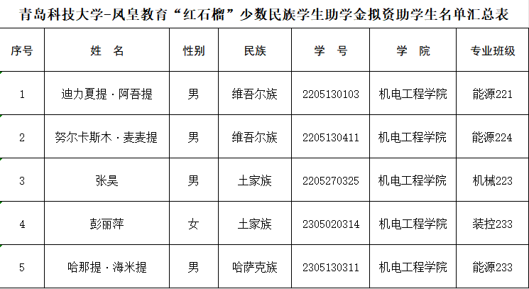 根据《关于评选2024年度凤皇教育“红石榴”少数民族学生助学金的通知》要求,经学生本人申请、学院评审等环节,评选出助学金5人,现将拟资助学生名单公示如下: