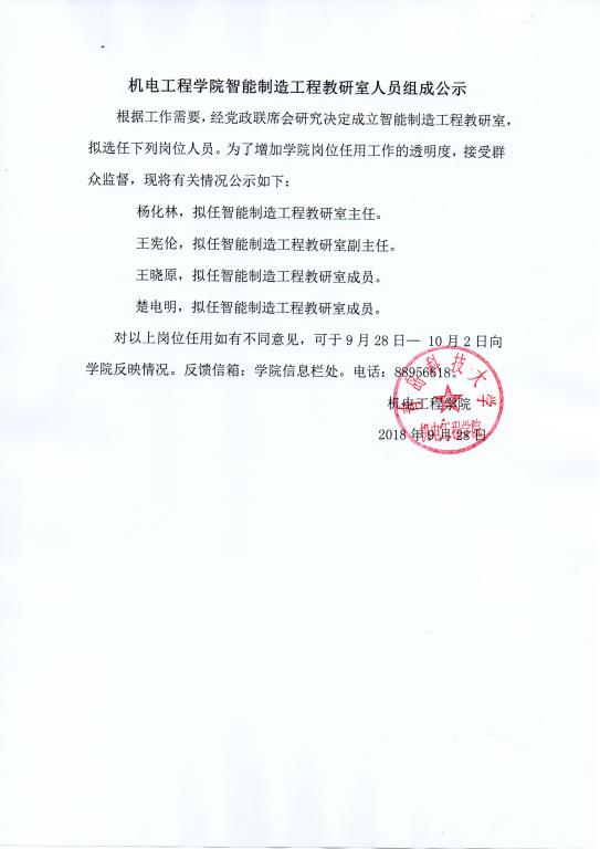 澳门十大信誉网赌大全智能制造工程教研室人员组成公示