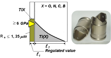 该技术旨在增加成对钛合金的磨损,包括那些在腐蚀性环境的条件。利用多组分的气体介质的来控制相形成和转化的过程,获得具有表面功能膜(TiO2,Ti2N,TiN,TiB,TiB2,TiCO,TiCN,TiNO)和过渡扩散层(100~200μm)的复杂梯度硬化层,主要用于耐高温、和磨损的钛合金航空零部件及耐磨损钛合金的人工关节上。目前,在国内尚没有该种钛合金表面处理提高硬度的技术,该技术具有重要的研究和应用价值。