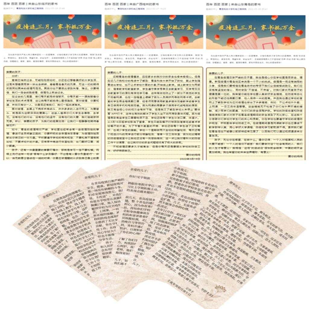 实施封校政策和线上教学举措后,学院第一时间发布了致家长的一封信,向家长说明学校的防疫政策与保障设施,减少家长的担忧。学院鼓励学生多与父母进行沟通,分享自己的校园生活和学习情况,号召老师与家长进行电话或视频交流,举办线上家长会。学院定期向家长说明学院的工作情况,积极开展“百年 百团 百家”家书接力活动,与家长们携手共建和谐安全的生活学习环境,保障学生的心理和身体健康。