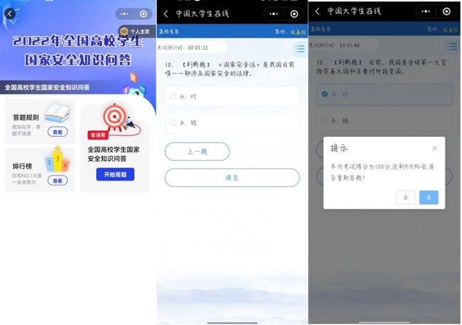 澳门十大信誉网赌大全组织同学们参与“全国高校学生国家安全知识问答活动”,全面普及学生安全意识,强化安全教育,大力营造校园安全文化氛围。知识题目涉及国家安全、网络安全、疫情防控、宿舍安全和食品安全等方面,2000余人积极参与知识竞答。此次答题活动具有很强的现实意义,在一定程度上进一步提升学生安全知识储备,提高了同学们学习安全知识的主动性与积极性。要切实增强学生的总体国家安全观和责任感,把校园安全工作抓早抓小、抓实抓细,营造时时讲安全,事事讲安全,人人讲安全,人人抓安全,保证人人安全的良好校园氛围。