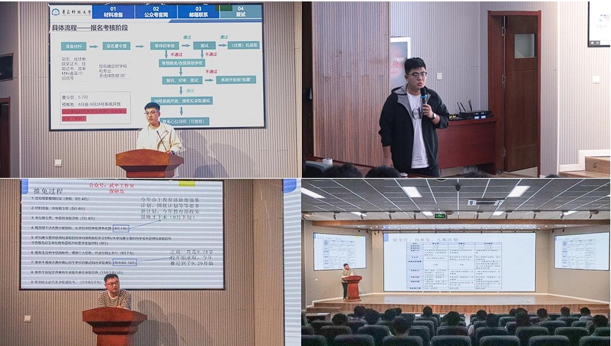 推免至吉林大学、机械202班王勇对专业学习对于现阶段保研的重要性进行了阐述,强调一切科研竞赛、社会实践和学生工作都是在专业学习基础上进行的。推免至中国科学院、机械201班张子沐对学院的科创保研政策进行了详细解读,通过自身参赛经历鼓励同学们在比赛中提高自己综合能力。推免至浙江大学、高机202班张钰鹏对夏令营、预推免、复试、录取等方面进行详细解读,为同学们解答了关于保研各个阶段需要如何科学规划,有序推进的疑惑。推免至中国科学院、机械202班王怀璋向同学们分享了自己大三时的保研规划,并对保研择校,夏令营准备等工作进行分享。推免至山东大学、机械中韩201班全恩郅对专业学习、科研竞赛、社会实践、价值追求四个方面进行总结,同时希望“保研边缘人”也应抓住最后机遇,通过不断努力达到自己的预期。
