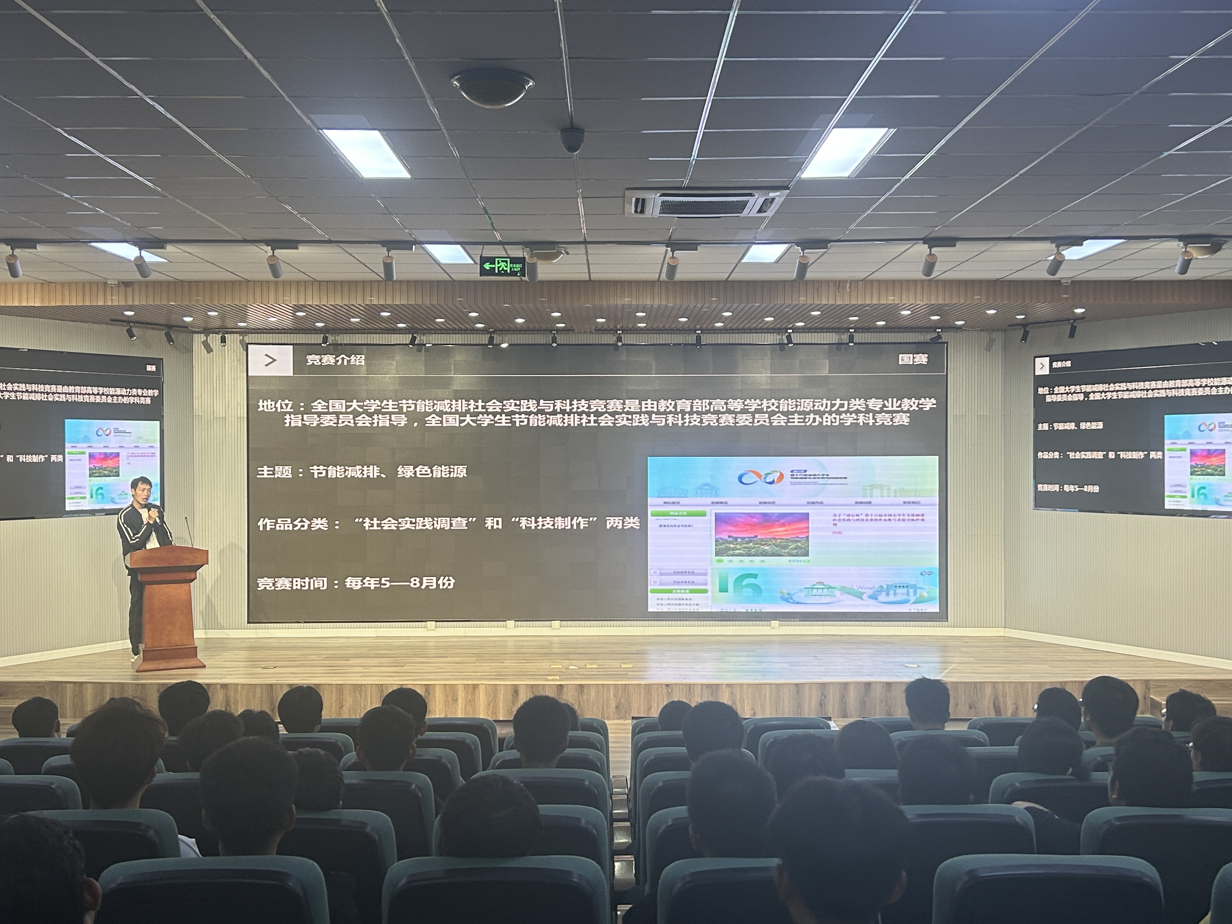 孙庆磊同学先对全国大学生节能减排社会实践与科技竞赛做了基本的介绍,与大家分享了大赛前的准备以及比赛过程首先中的经验,强调了比赛中所需的注意事项,鼓励同学们积极参与节能减排大赛。随后赵振瑞同学与大家分享了中国高校智能机器人创意竞赛过程中的所见所观以及所感,建议大家要尽可能多的充实自己,多去学习与专业有关的课外知识技能,并向大家讲述了各位学长学姐准备比赛的经历与过程。