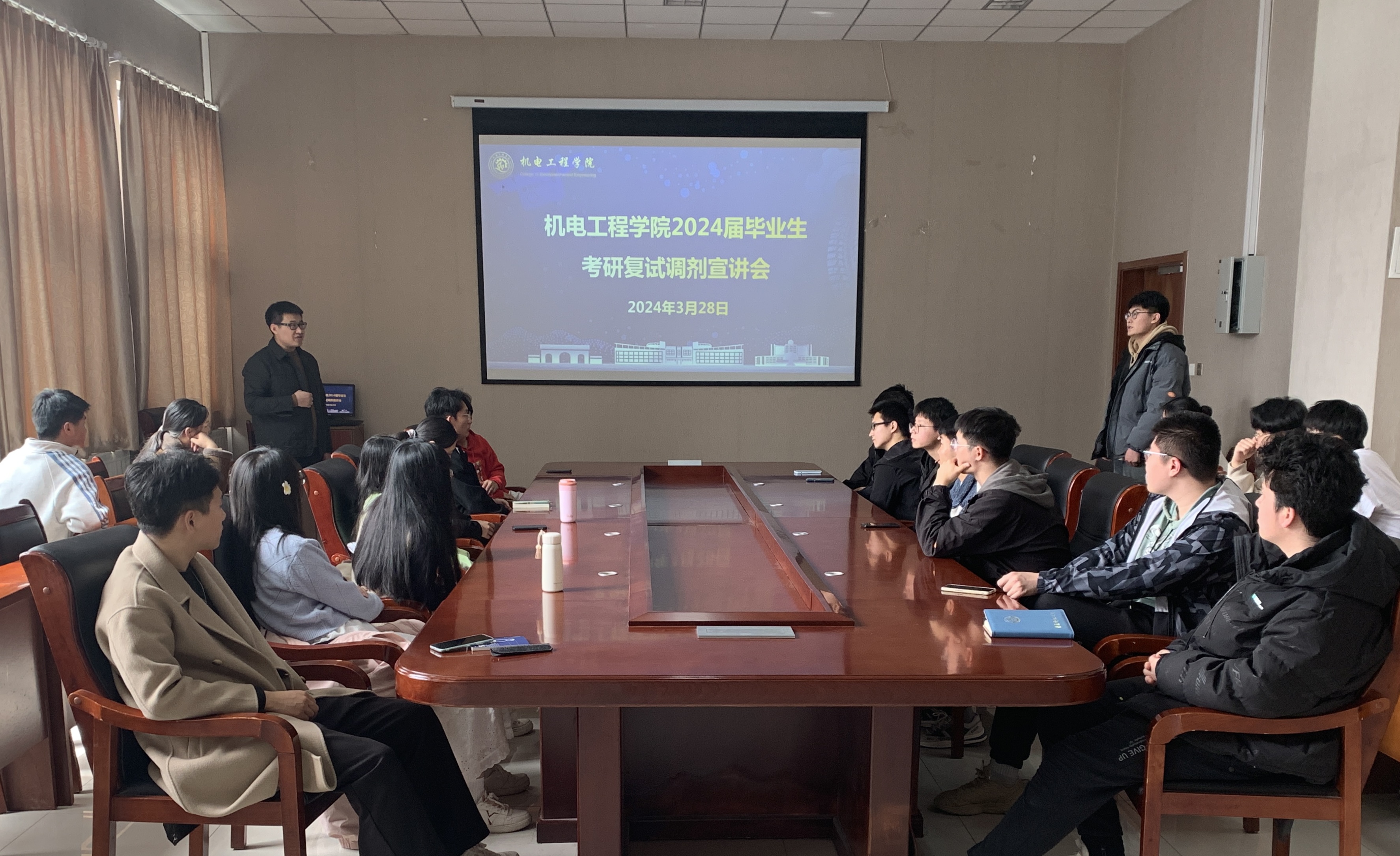 3月28日,澳门十大信誉网赌大全2024届毕业生考研复试调剂宣讲会在机电楼518会议室举办。副院长刘治明参加会议并进行复试调剂指导,毕业班辅导员、2024届考研学生代表参加宣讲会。
