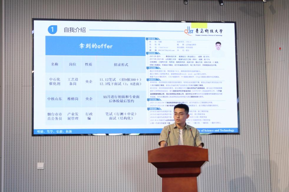 崔佩璇,已成功签约中石化第四建设有限公司,她分享了自己从投递简历,到面试失败,再到成功签约央企的求职经历,同时着重为同学们讲解了一份优秀简历的制作要点,并建议同学们在求职的过程中要重视对求职时间节点的合理规划,及时释放情绪,调整好心态面对现在的就业形势。