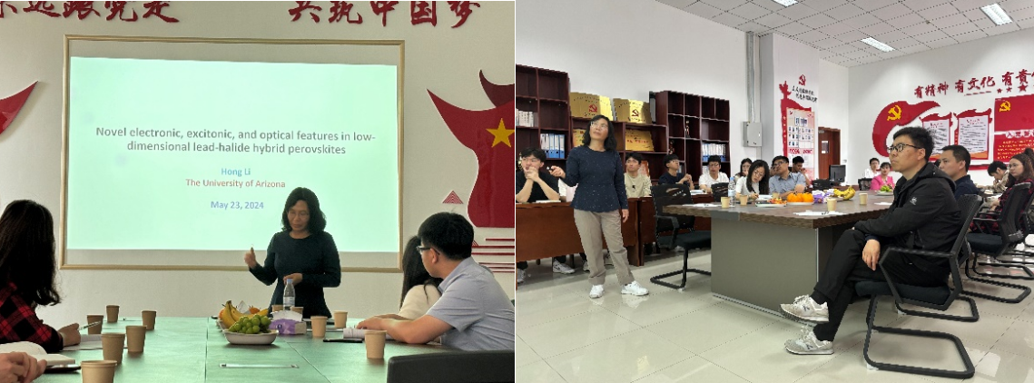 5月23日,美国亚利桑那大学化学与生物学院Li Hong教授受邀莅临澳门十大信誉网赌大全,开展题为“低维铅-卤化物杂化过氧化物中的新型电子、激子和光学特征”的学术报告。山东大学的李元老师、吉林大学的王同辉老师,青科机电新能源科学与工程系的刘治明、王晓君、白文娟、楚电明、李建伟、王雨霄和李慧芳等老师,以及能源动力工程专业的部分研究生到场听取了本次报告。