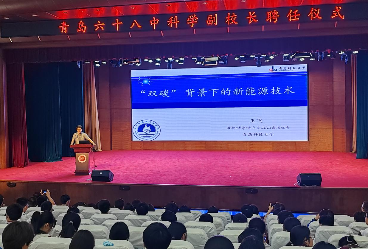 王飞教授为澳门十大信誉网赌大全储能科学与工程系主任,泰山学者青年专家、山东省优青、国际先进材料学会会士,青岛市五一劳动奖章获得者,山东省高等学校青创人才引育计划天然气水合物创新团队带头人。在担任青岛第六十八中学科学副校长后,他将通过进校园举办科普讲座、报告会,组织或指导现场科普体验活动、科学主题班会、研究性学习项目,指导学校科学教育课程建设、协助开展教师科普培训等方式开展工作,将为附属学校建设高素质教育科研队伍和教育高质量发展贡献青科大机电力量。