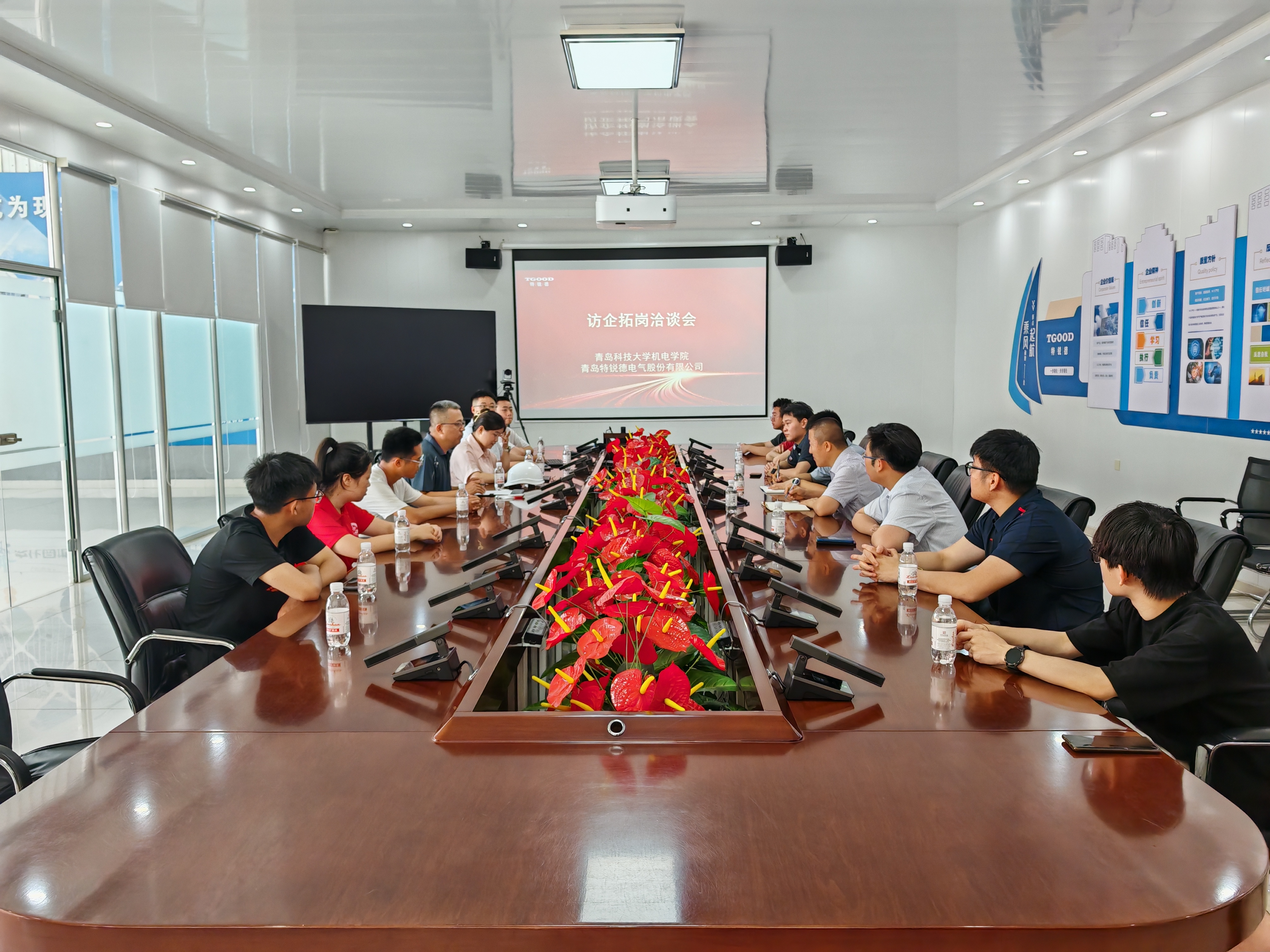 杨小明一行实地参观了特锐德中低压车间、大箱变和海外交付中心等厂区,深入了解企业生产流程、技术研发、海外业务布局等,切身感受其在电力设备智能制造领域的领先技术实力与产业优势。随后,双方举行座谈会,王贵罡介绍了公司经营状况、发展战略及人才需求,重点介绍了学院院友在特锐德的发展情况,并对青科大人才培养和毕业生素质给予了高度评价。杨小明介绍了澳门十大信誉网赌大全的学科建设、专业设置、人才培养、中韩合作办学等方面情况,重点介绍了2026届毕业生情况,希望特锐德在接下来的校园招聘工作中,吸收更多优秀科大学子加盟特锐德。随后双方就科研合作、成果转化、人才培养等方面进行交流洽谈。参加活动的3名2026届毕业生表达了自己加盟特锐德的强烈愿望。