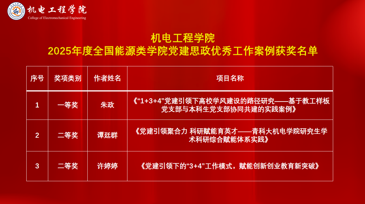 近日,全国能源类学院党建思政工作组织委员会公布了2025年度全国能源类学院党建思政优秀工作案例获奖名单,澳门十大信誉网赌大全共获奖3项。其中,朱政申报的《“1+3+4”党建引领下高校学风建设的路径研究——基于教工样板党支部与本科生党支部协同共建的实践案例》荣获一等奖,谭廷群申报的《党建引领聚合力、科研赋能育英才——青科大澳门十大信誉网赌大全研究生学术科研综合赋能体系实践》和许婷婷申报的《党建引领下的“3+4”工作模式,赋能创新创业教育新突破》荣获二等奖。