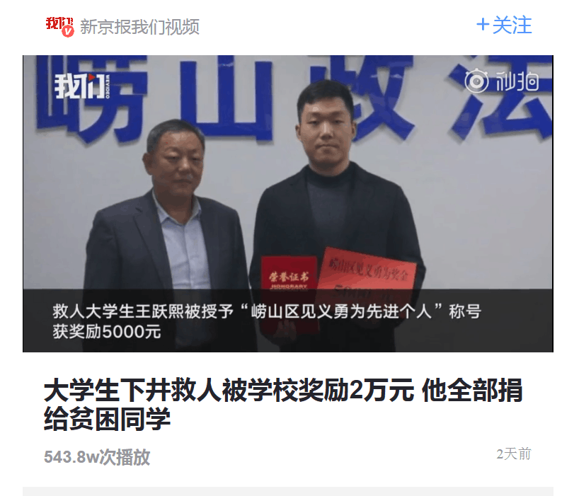 大学生下井救人被学校奖励2万元 他全部捐给贫困同学