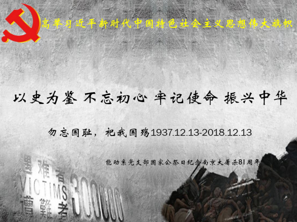 12月13日,能动系党支部在澳门十大信誉网赌大全518会议室召开支部全体党员大会,开展“以史为鉴,不忘初心,牢记使命,振兴中华”主题党日活动,缅怀南京大屠杀的无辜死难者,缅怀所有惨遭日本侵略者杀戮的死难同胞,缅怀为中国人民抗日战争胜利献出生命的革命先烈和民族英雄。