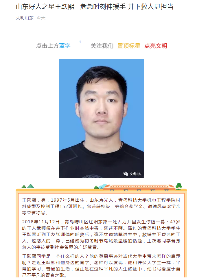近日,信誉网赌成型中韩152班班长王跃熙同学获评山东好人之星。王跃熙同学在危急时刻伸出援手,英勇井下救人,受到社会各界广泛赞誉,展现了新时代机电学子新青年新形象。