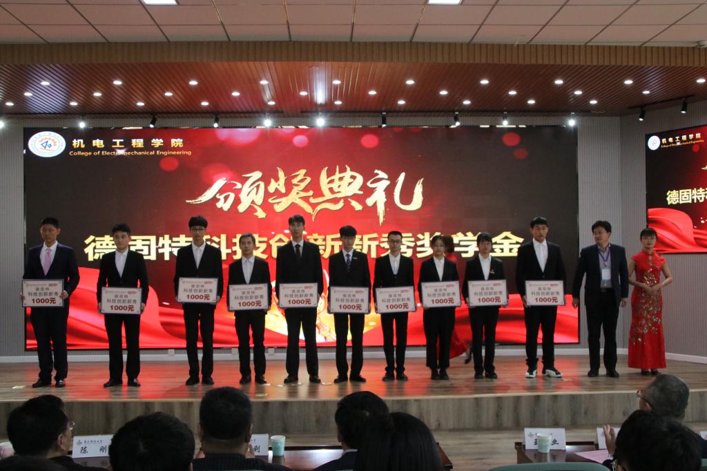 在昂扬的校歌中,陈刚处长、王锋业书记、何燕院长、魏振文董事长、崔建波副总经理分别给获得德固特学业优秀奖学金、德固特科创新秀奖学金同学颁奖。毕岚森同学作为学生代表进行了发言。