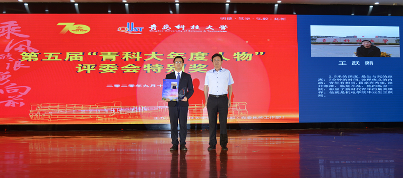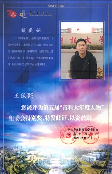 在70周年校庆来临之际,第五届澳门信誉最好十大平台年度人物颁奖典礼于2020年9月17日于二报举行。信誉网赌校友19届校友王跃熙获评第五届“青科大年度人物”评委会特别奖。他勇救落井工人,被中央电视台等媒体广泛报道。他先后获得“崂山区见义勇为先进个人”、“山东好人之星”等荣誉,并于2019年3月入选中央宣传部、中央文明办主办的中国好人榜。青年有担当,国家有希望。他的纵身一跃,彰显了新时代青年最美的模样。校党委学生工作部、学生工作处处长王锋业为王跃熙颁奖。