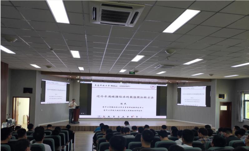报告中,陈民教授引用过冷水滴导致空难事故为背景切入主题,以水滴撞击表面的结冰实验和静止水滴的结冰实验详细介绍了亲水和超疏水表面上常温水滴碰撞、常温水滴碰撞结冰和过冷水滴碰撞结冰的过程,提出了过冷水滴碰撞结冰过程的数值模拟新方法和模型。随后,陈民教授与副院长张斌、陈伟老师进行了交流互动,以微纳尺度传热传质与相变、微纳流动与空化等方面细致入微的见解,耐心解答了老师们的问题。此次报告让现场师生感受到了物理与数学相结合的独特魅力,激发了同学们对工程热物理领域的浓厚兴趣。