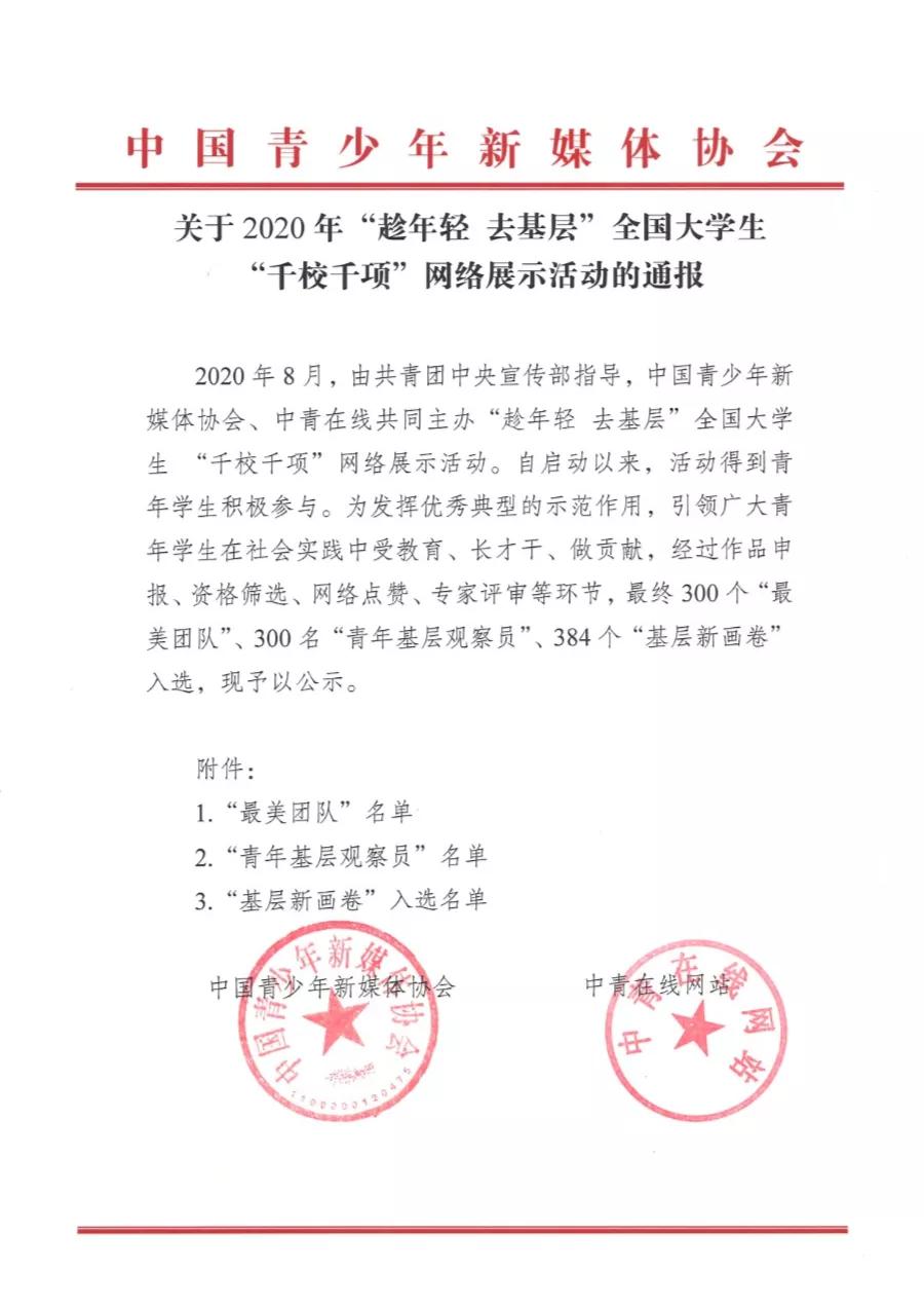 近日,由共青团中央宣传部指导,中国青少年新媒体协会、中青在线共同主办的“趁年轻 去基层”全国大学生“千校千项”网络展示活动顺利举行。自启动以来活动得到青年学生的积极参与,经过作品申报、资格筛查、网络点赞、专家评审等环节,最终在《关于2020年“趁年轻 去基层”全国大学生“千校千项”网络展示活动的通报》中,信誉网赌耿宇轩同学带领的澳门信誉最好十大平台“百尺竿头更进一步·礼赞党建百年征程”红色文化调研团获评此次活动“最美团队”荣誉称号。