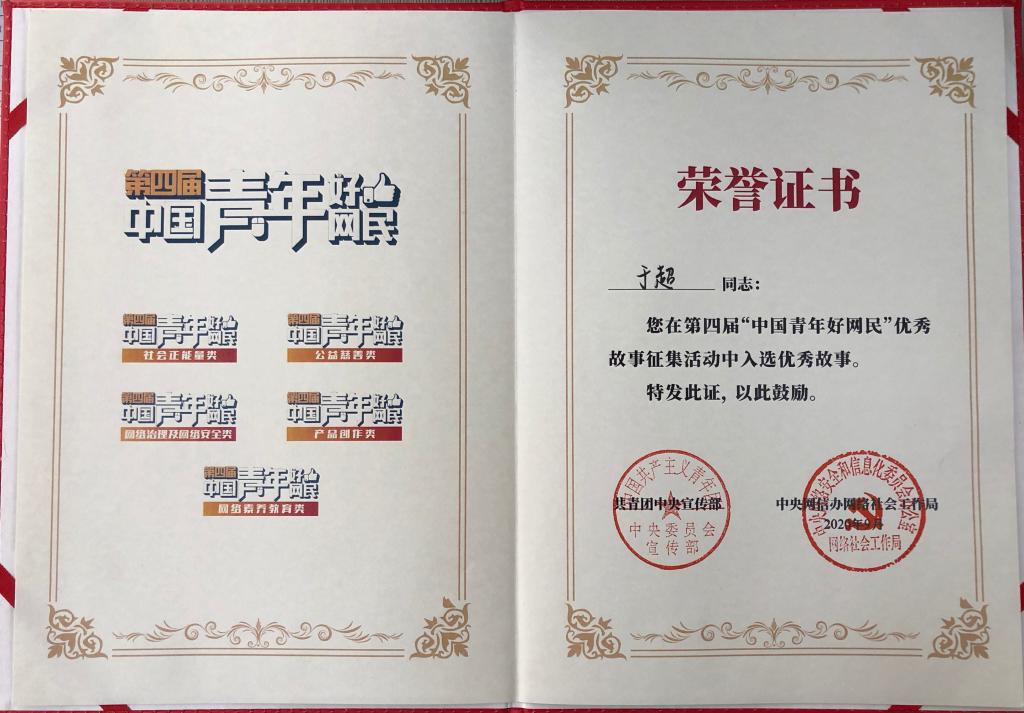 近日,经过共青团组织推荐,澳门信誉最好十大平台澳门十大信誉网赌大全辅导员于超在共青团中央宣传部、中央网信办网络社会工作局主办的第四届“中国青年好网民”优秀故事征集活动中脱颖而出,荣获“中国青年好网民”荣誉称号。