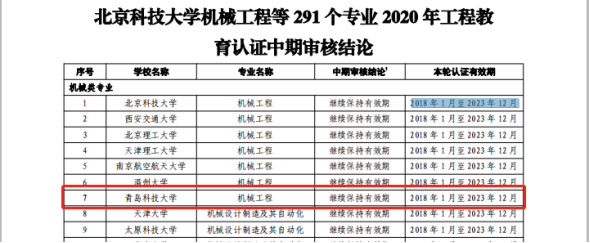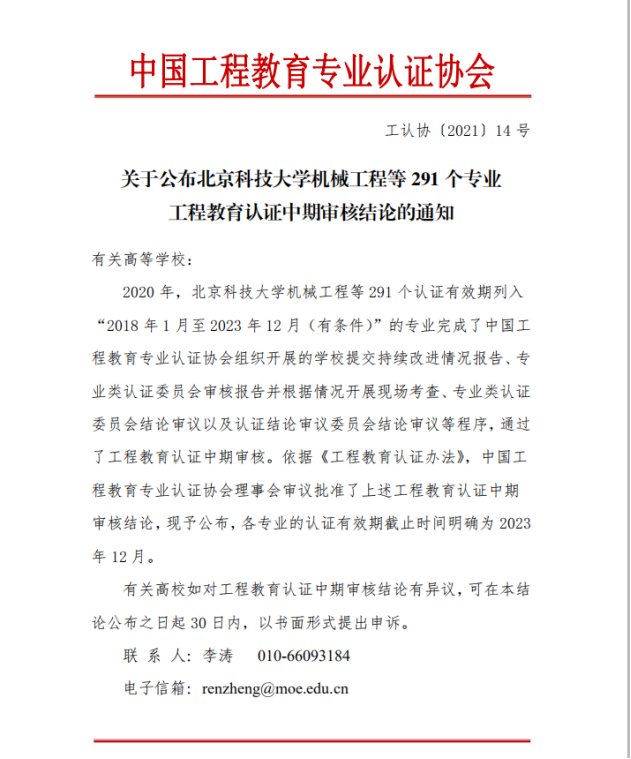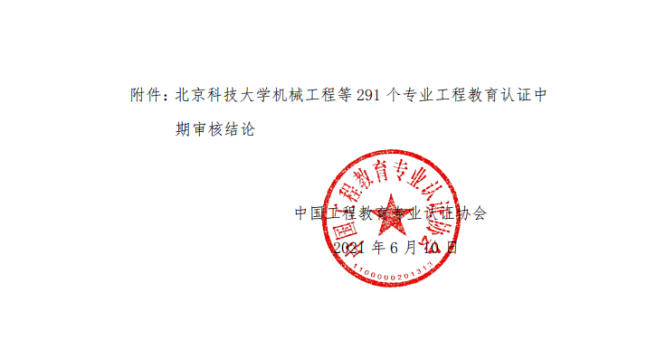 近日,中国工程教育专业认证协会发布了《关于公布北京科技大学机械工程等291个专业工程教育认证中期审核结论的通知》,信誉网赌机械工程和过程装备与控制工程两个专业在列,审核结论为“继续保持有效期”,本轮认证有效期为“2018年1月至2023年12月”。