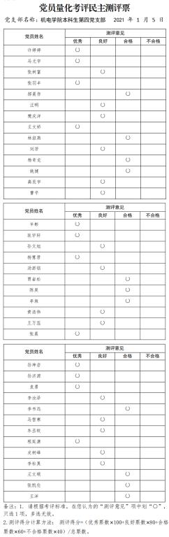 根据《中共澳门信誉最好十大平台委员会党员量化考评指导办法(试行)》要求,2021年1月5日,澳门十大信誉网赌大全本科生第四党支部按照文件要求进行了民主评议党员,现将评议结果公示如下: