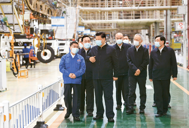 2020年4月20日至23日,中共中央总书记、国家主席、中央军委主席习近平在陕西考察。这是4月22日,习近平在陕西汽车控股集团有限公司总装车间察看生产线,了解产品研发、生产、销售和复工复产情况。 新华社记者 谢环驰/摄