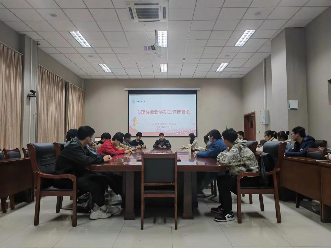 新学期伊始,为进一步做好学院心理安全稳定工作,做好新学期心理协会工作的安排,扎实推进学生的心理服务工作 ,3月9日晚,学院心理协会在机电楼518会议室召开了“新学期工作部署会议”。心理协会全体成员参加。