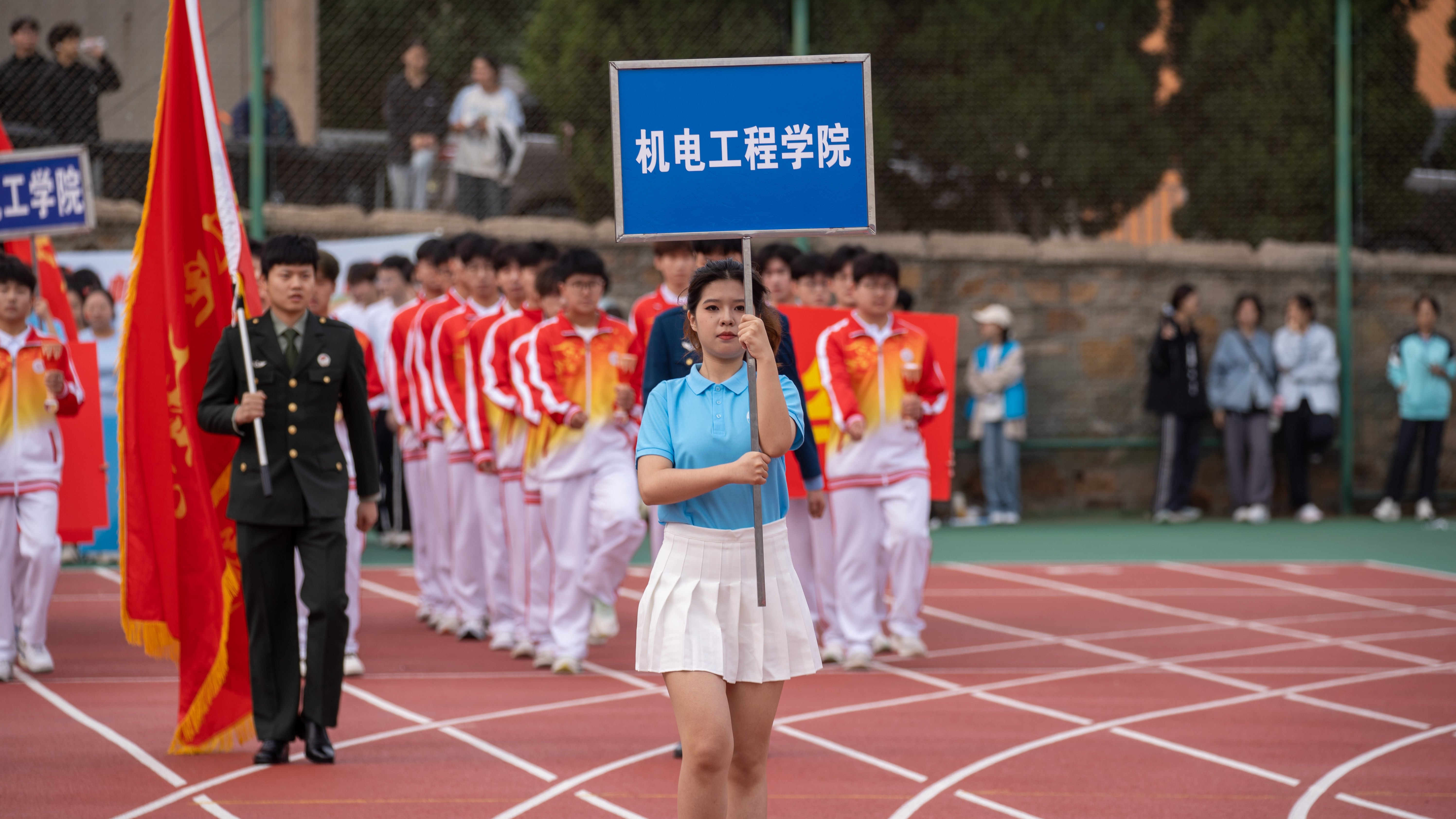 “乘风破浪,斗志昂扬,机铸梦想,智造辉煌”伴随着响亮的口号和激昂的进行曲,澳门十大信誉网赌大全方队以整齐的步伐和饱满的精神惊艳全场。48名机电学子身着鲜艳的院服,手持火炬,展现出机电人特有的坚毅与自信。