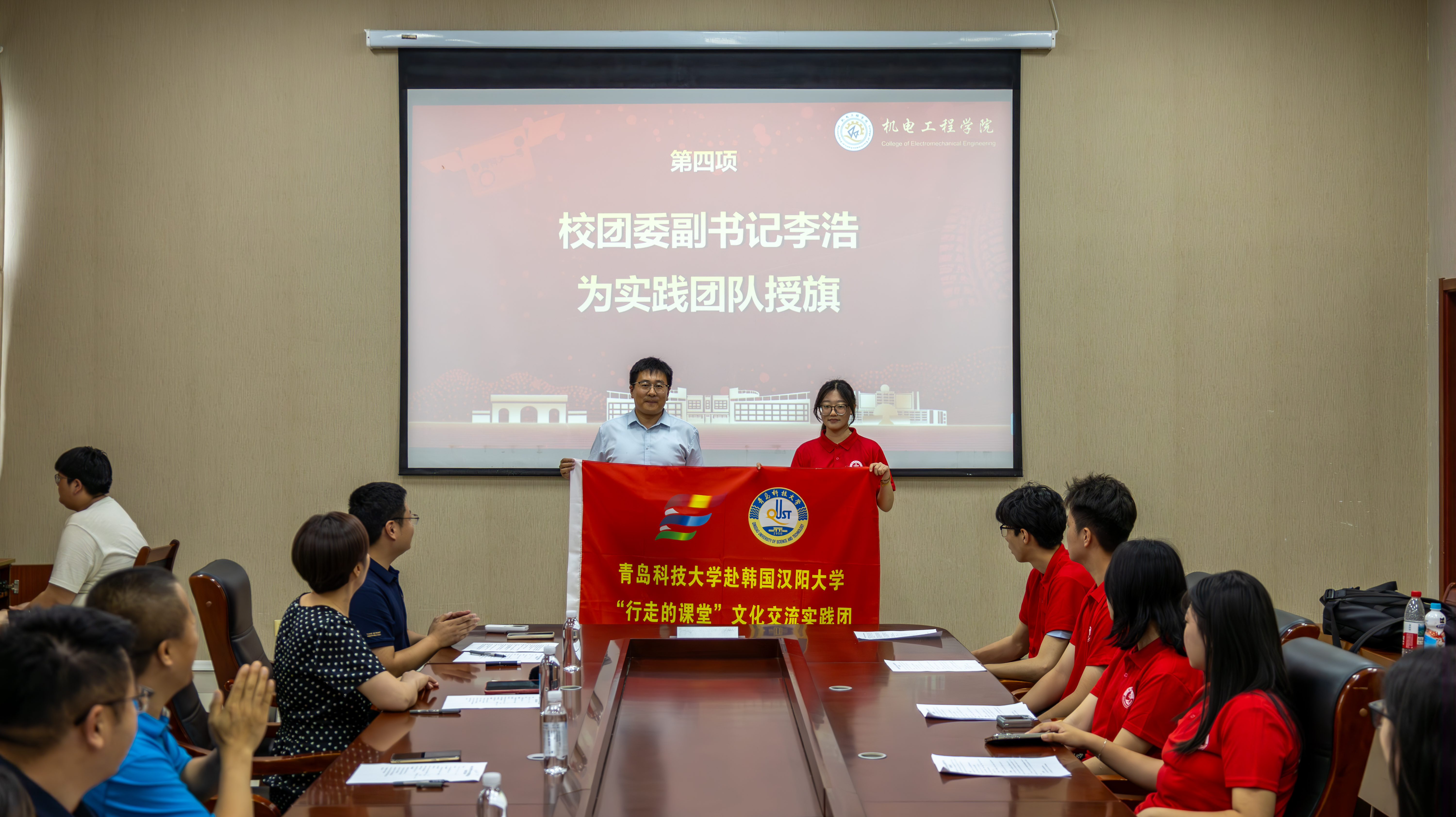 7月15日,澳门十大信誉网赌大全2025年赴韩国社会实践出征仪式在D3-518会议室举行。校团委副书记李浩、学院党委副书记兼副院长杨小明、国际交流合作处涉外办学管理科科长邱南南、学院团委辅导员老师及学生代表参加活动。