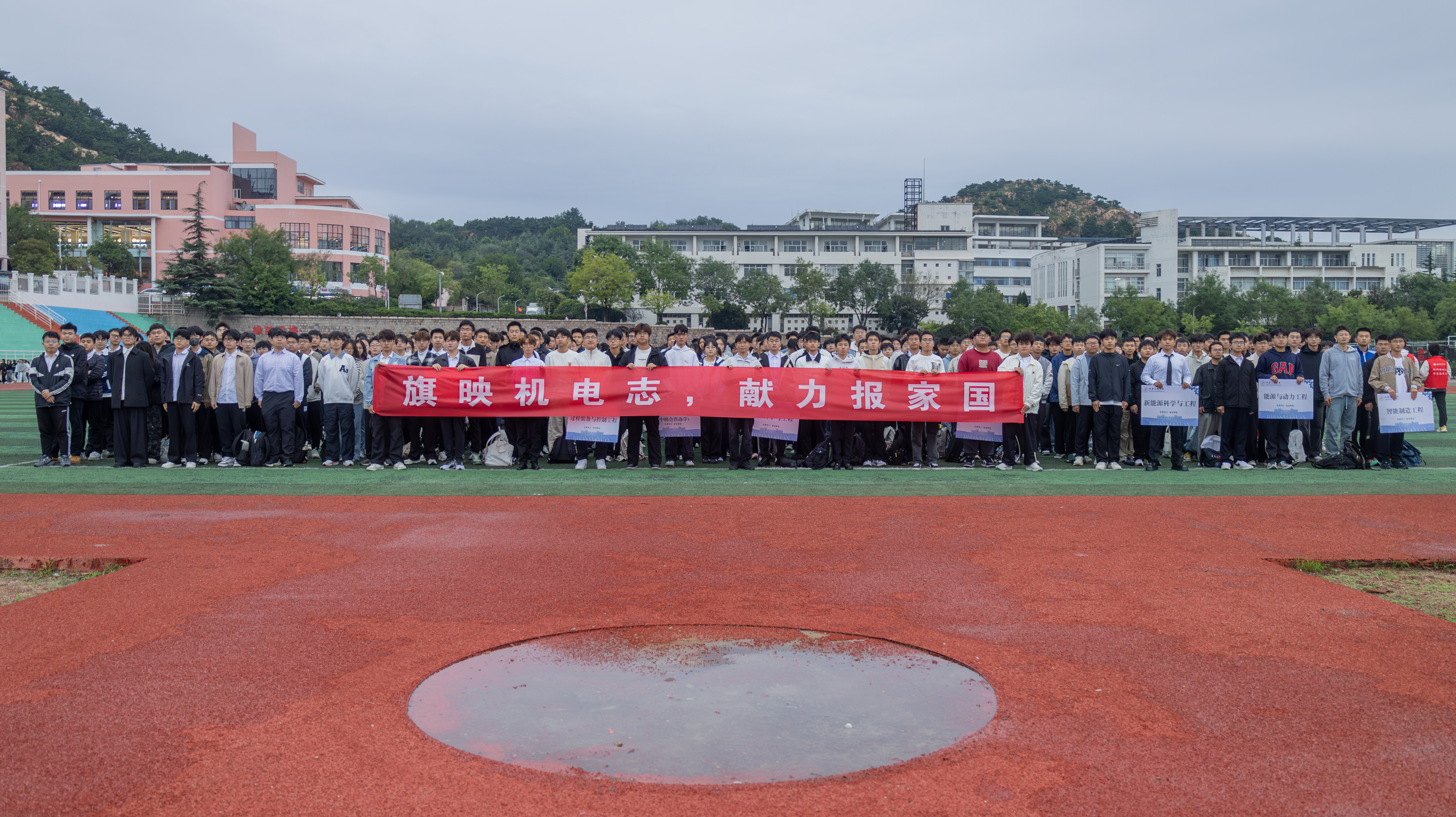 为进一步厚植青年学子爱国情怀,凝聚奋进力量,引导广大青年学生将个人理想融入国家发展大局,10 月 13 日澳门十大信誉网赌大全于崂山校区南苑操场开展“旗映机电志,献力报家国”升旗仪式。学院党委副书记兼副院长杨小明,学院团干部、各年级团学骨干、青年团员、学生代表近2000人齐聚操场,升旗仪式由学院团委书记逄柏鹏主持。