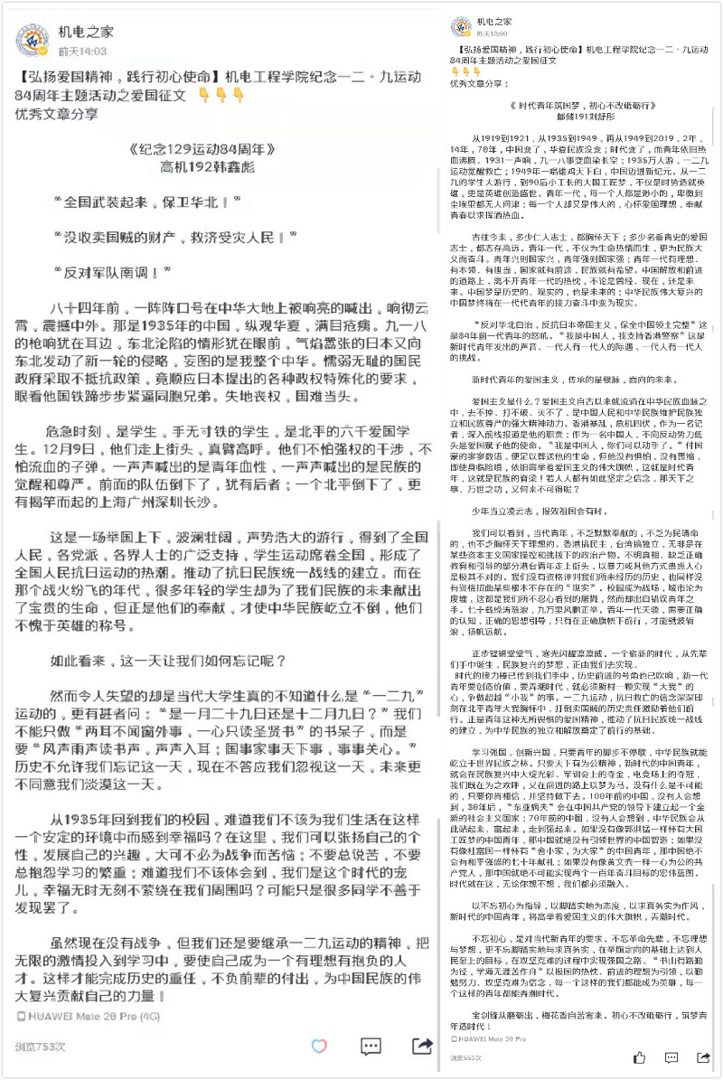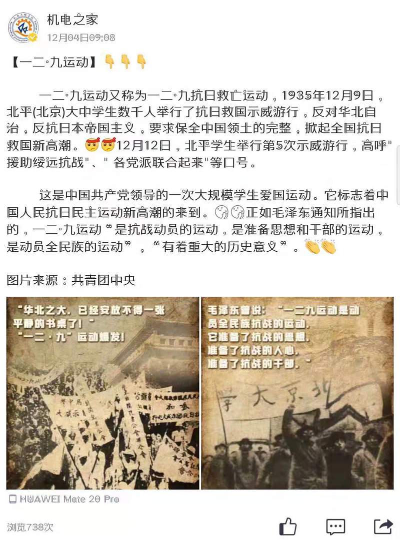 澳门十大信誉网赌大全面向全体2019级青年学生开展“纪念一二•九运动”爱国主题征文活动,征文活动发出后,受到广泛且热烈的追捧,经选拔,共计五篇优秀征文脱颖而出,在学院学生会自媒体平台“机电之家”公众号上推广展示。