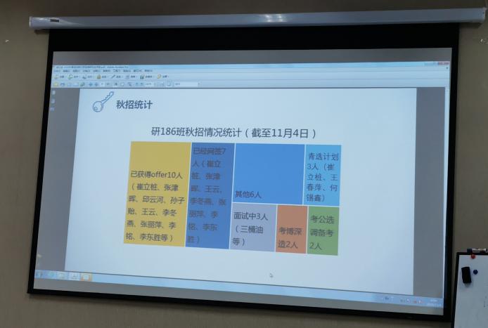 答辩会共分为优秀研究生干部评选和优秀研究生评选两个部分。答辩过程中每位候选人通过PPT进行三分钟的个人情况介绍,着重阐述自己在研究生期间的工作生活、科研成果以及思想态度,由评审工作领导小组对候选人进行综合评价。最终,确定毕杰等17名同学为优秀研究生推荐人选,江峰等10名同学为优秀研究生干部推荐人选。